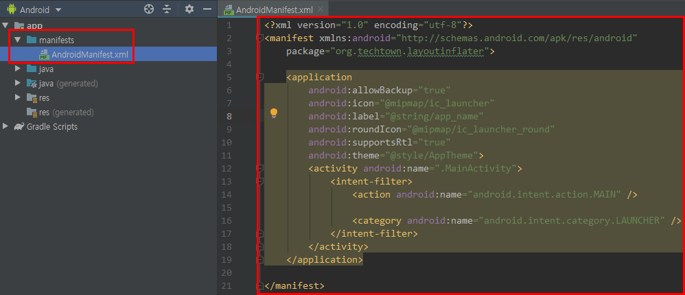 모든 앱 프로젝트에 manifests 폴더 안에 AndroidManifest.xml 파일이 있어야 한다.