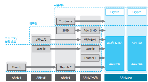 가상화와 시큐리티 지원 기능이 추가되며 현재의 ARMv8에까지 이르게 됬다.