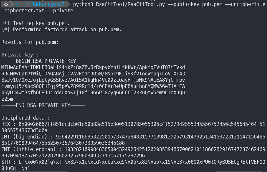 rsactftool을 이용해 풀어보면, 평문값을 구할 수 있다.