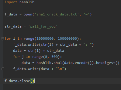 sha1은 해시이므로 복호화가 불가능하다. 그래서 레인보우 테이블을 만들어 해당 문제로 주어지는 해시값을 테이블에서 찾아 평문 값을 구할 것이다. (레인보우 테이블에는 평문과 마지막 해시값만 출력하게 할 것이다)