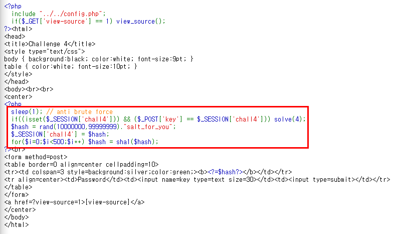 view-source 페이지를 클릭해 보면 해당 페이지의 php 소스가 나온다. 첫 번째 php 코드 부분은 그냥 view-source를 보여주는 부분이니 패스 두 번째 php 소스를 보면 solve(4) 부분을 볼 수 있다. 그렇다는 것은 이 부분을 분석해 우회하면 된다는 것이다.